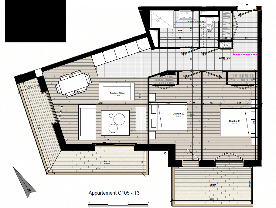 The C105 offer two large bedrooms, a bathrrom, WC, a large living room with a balcony facing South
