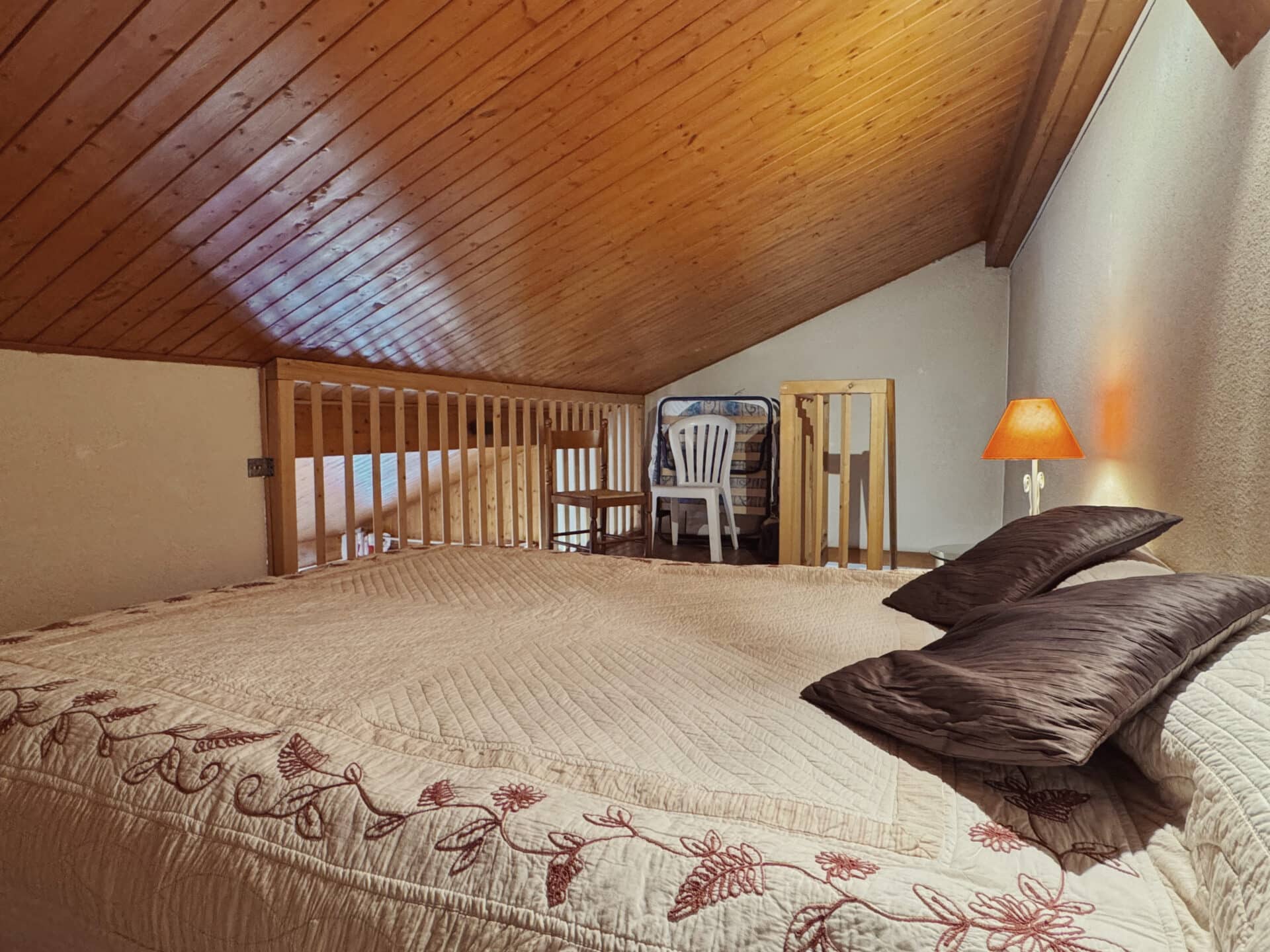 The duplex is on the second floor and has two balconies (south and west facing). It offers a well-appointed space with a lovely new kitchen, a large double bedroom with cupboards, a good-sized mezzanine serving as a second bedroom, a shower room, separate WC and an entrance hall with cupboard.